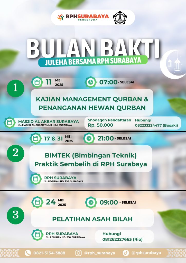 Menyambut bulan bakti tahun 1446 H, Juleha Jawa Timur bekerja sama dengan RPH Surya Surabaya menggelar beberapa event. Diantaranya adalah Kajian Manajemen Qurban, Bimbingan Teknis, dan Pelatihan Asah Bilah.