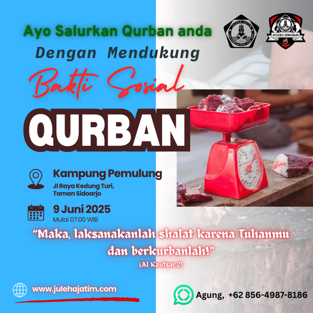 InsyaaAllah Juleha Jatim Sidoarjo akan menyelenggarakan Bakti Sosial pada tanggal 9 Juni 2025 dalam rangka rangkaian Hari Raya Idul Qurban 1446 H. Kegiatan ini merupakan acara rutin yang diselenggarakan setiap tahun.